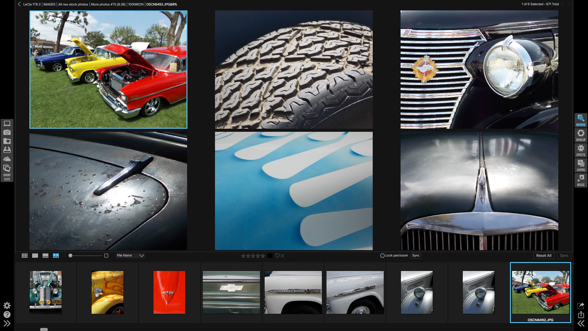 Customizing these effects just so and applying them to multiple images is not something you want to do over and over. The filmstrip view icon near the lower left of the interface brings up multiple images which you can select in bulk, and to which you can quickly apply the current effect.
