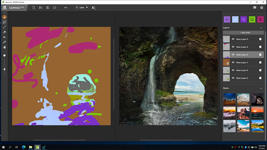 Some may consider the use of AI generative imaging a regression of our digital progress, but we need to include these as well! The first example is from 2021 where I was using NVIDIA’s online Canvas app to manually draw an oceanside scene I imagined while it previewed and rendered in real time: