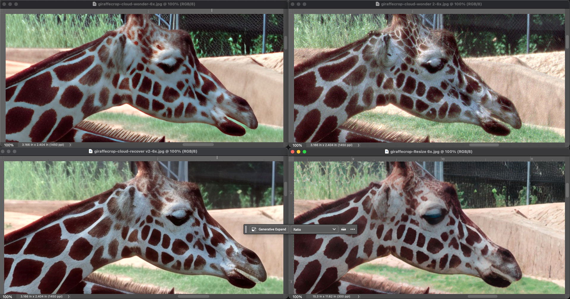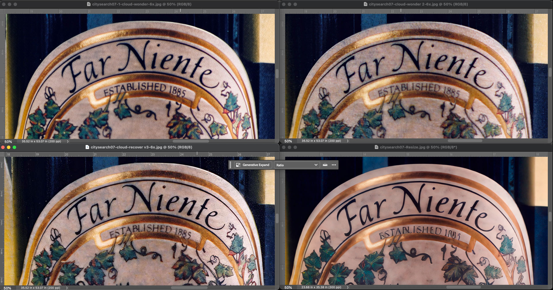 Here is a comp, as seen at 50% in Photoshop, of the results of 6X enlargements from 3 different Topaz cloud models (Wonder v1, Wonder v2, Recover v3) and the Highest Quality settings available in ON1’s local-only processing. In this case, Topaz’ Wonder 2 provided the best results (upper right):