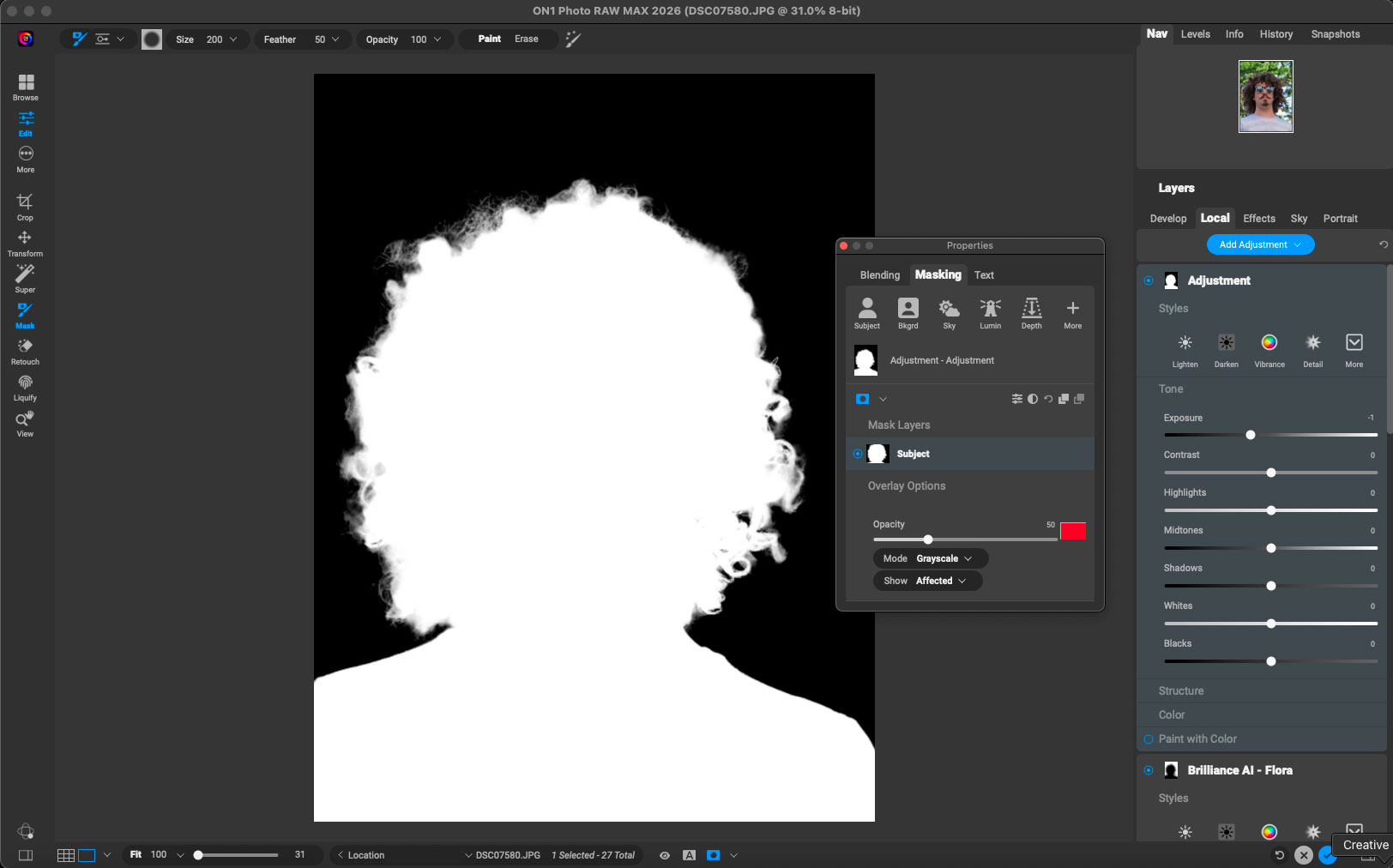 I poked through a handful of these new features, starting with “One-Click Subject & Background Masking”. I chose a very difficult image (a man with curly hair against a piney-type tree) and Photo RAW made quick work of the isolation, with no further work done on my part: