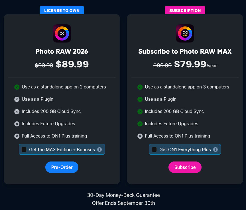 If you pre-order ON1 Photo RAW 2026, you don’t have to wait. Get ON1 Photo RAW 2025 today, plus ON1 Photo RAW 2026 the moment it launches next month — all for one price. It’s the best Lightroom alternative with real ownership or subscription flexibility.