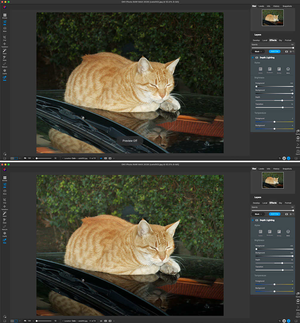 Next up was “Add Cinematic Depth Lighting in Seconds”. I dredged up some old digital images with imbalanced lighting and gave this feature a try (notice the difference between foreground and background in each set):