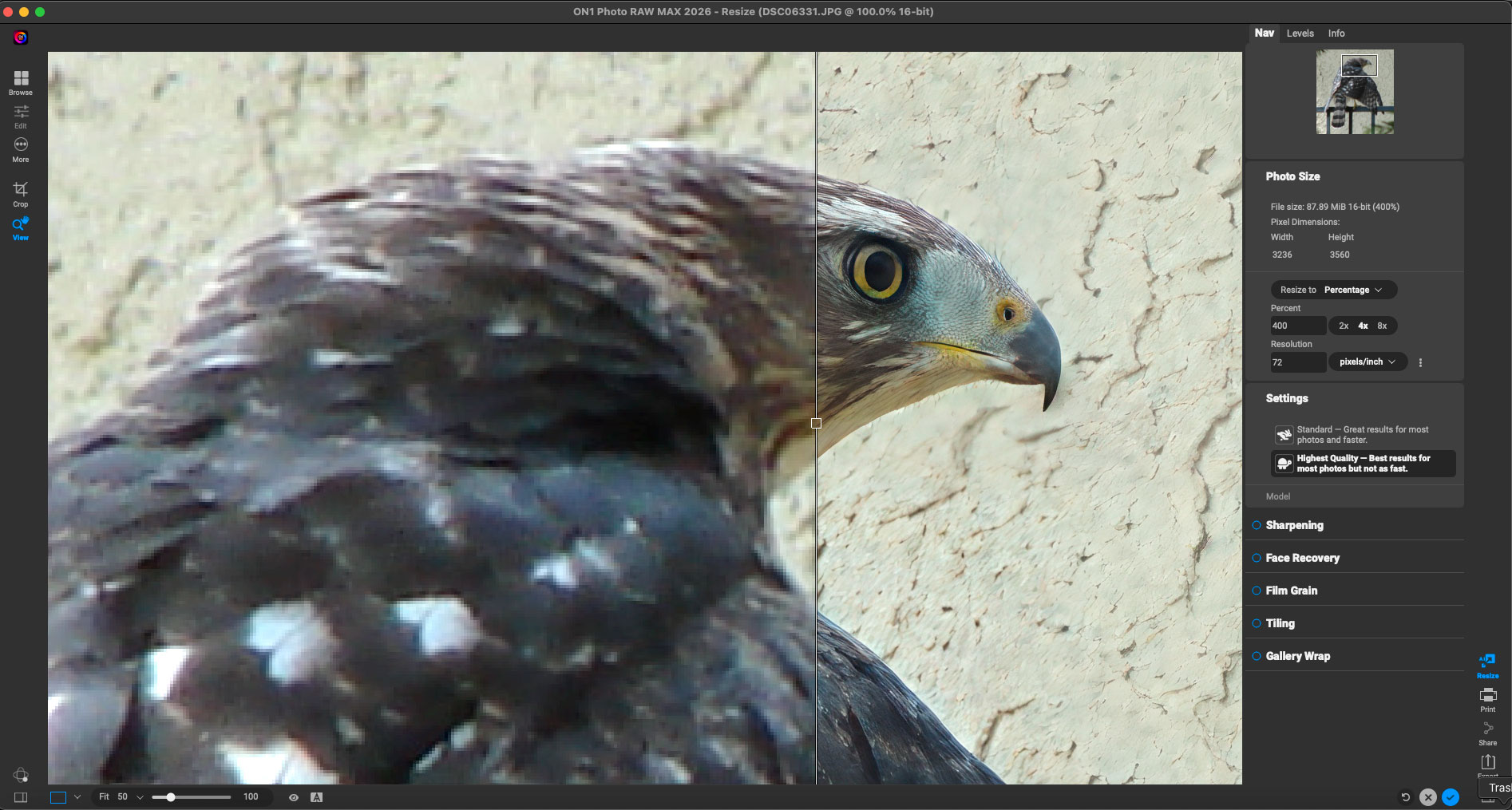 In Photo RAW 2026 I cropped and slightly rotated the original, after which I applied Resizing at 4X with the Highest Quality model (no other ON1 enhancements were activated). You can see the before-and-after at 100% here (I also posted this screenshot full size, please open in a new window):
