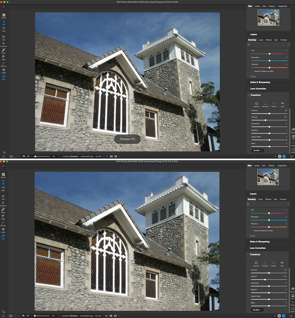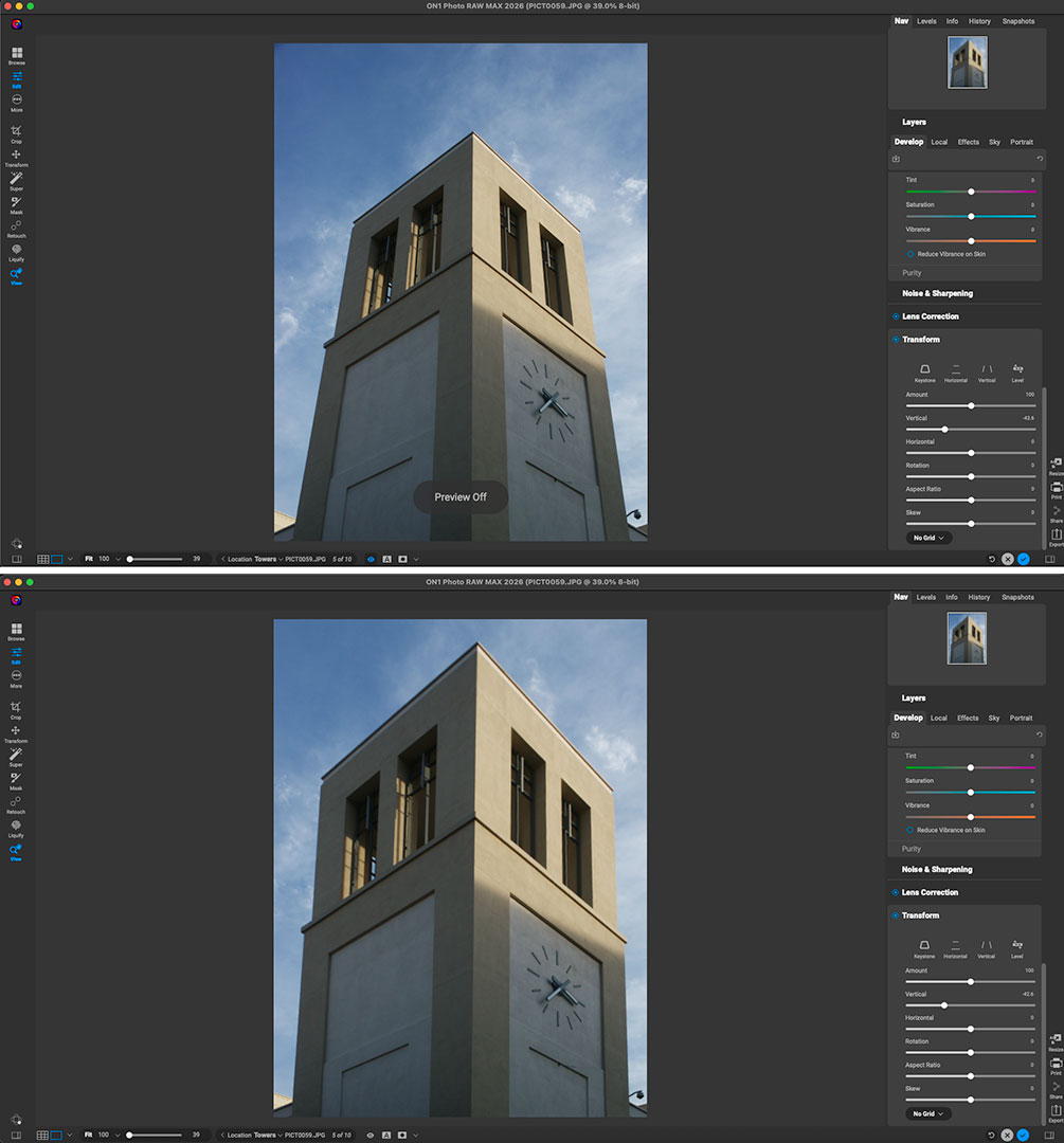 Architectural perspective correction is a very quick fix using the Transform tool (“Fix Crooked Buildings Without Losing Image Edge”) – just click an option and drag the slider!