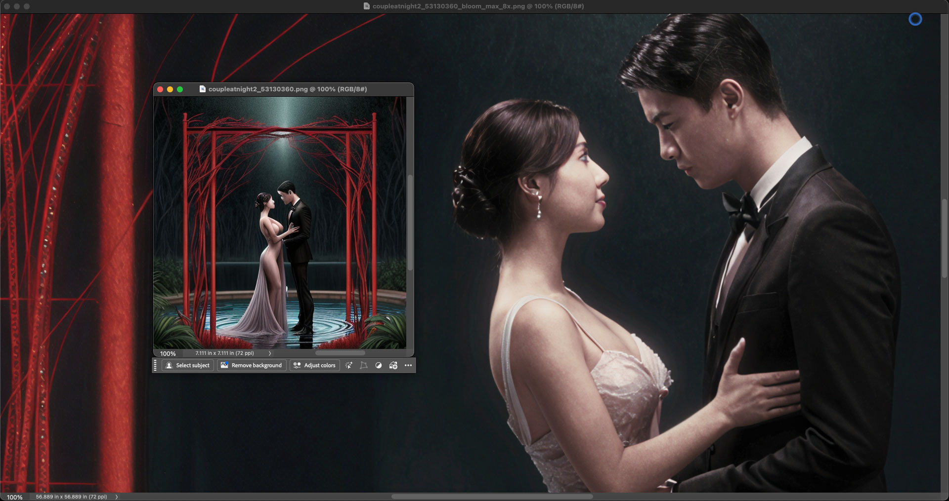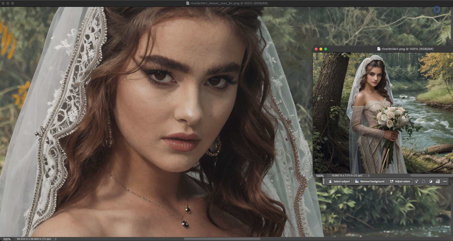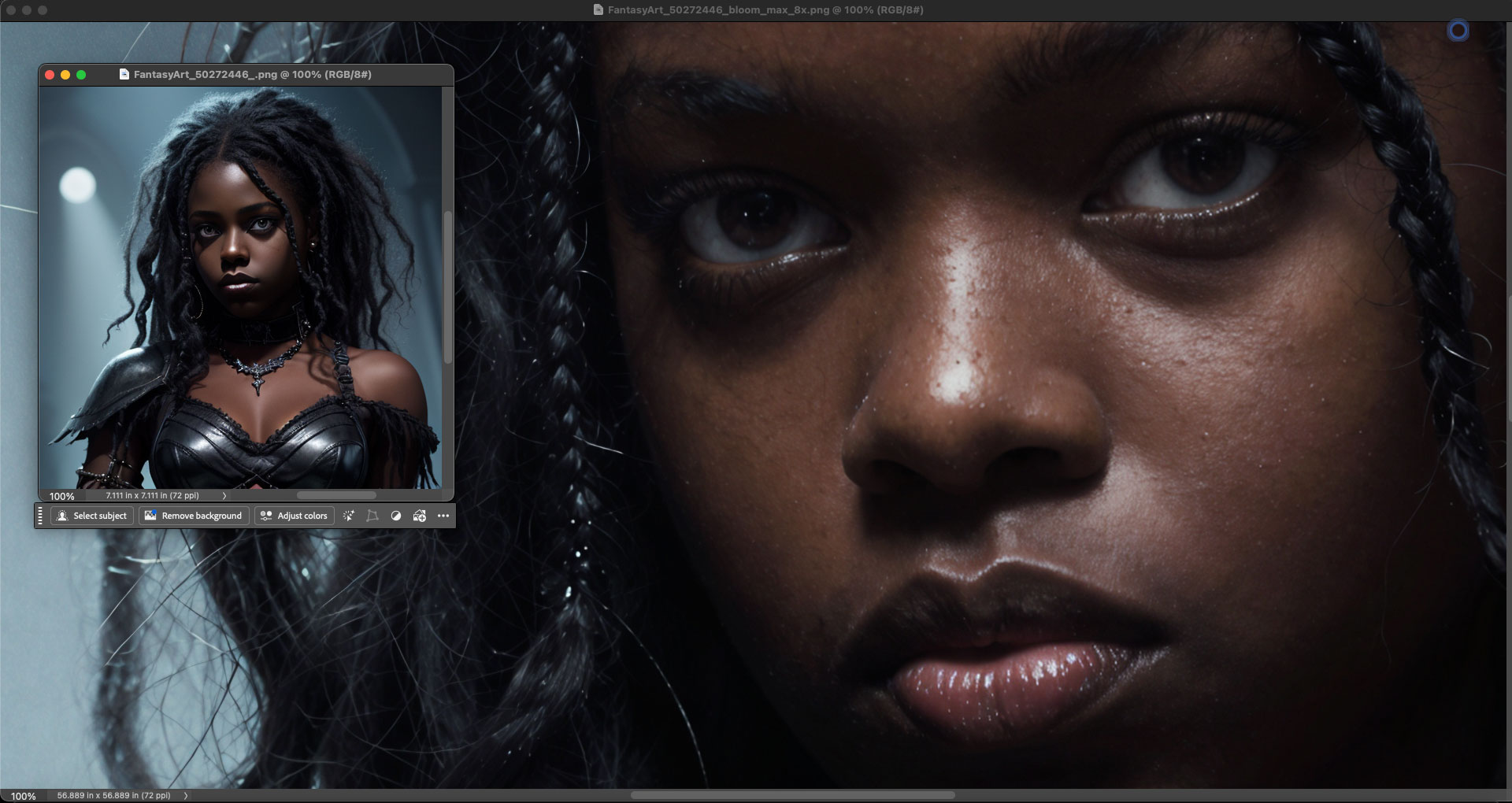 (Note: For the sake of honesty in presentation, the original AI renders and Bloom results were not prepped or retouched in these screenshots, though all could use some Levels work and minor spotting, etc. Please view the results at 100% for the best detail):