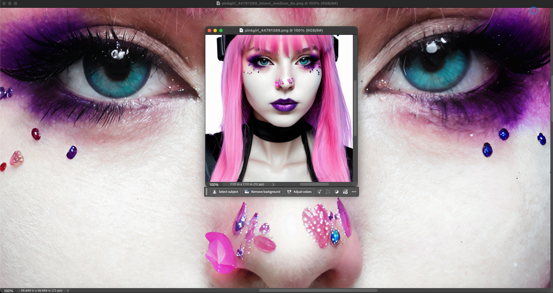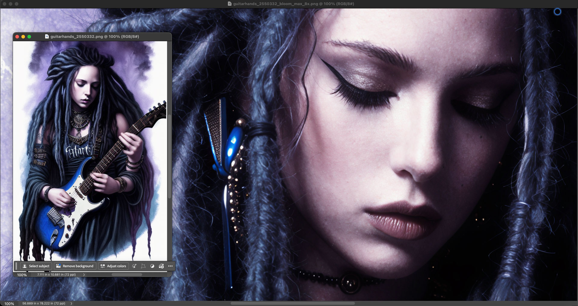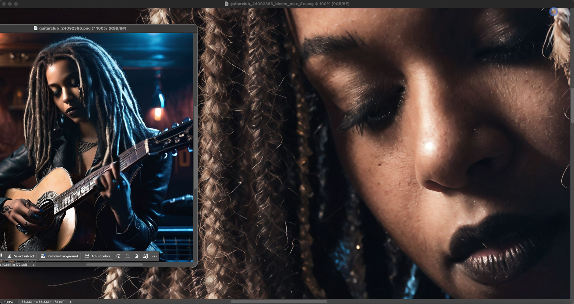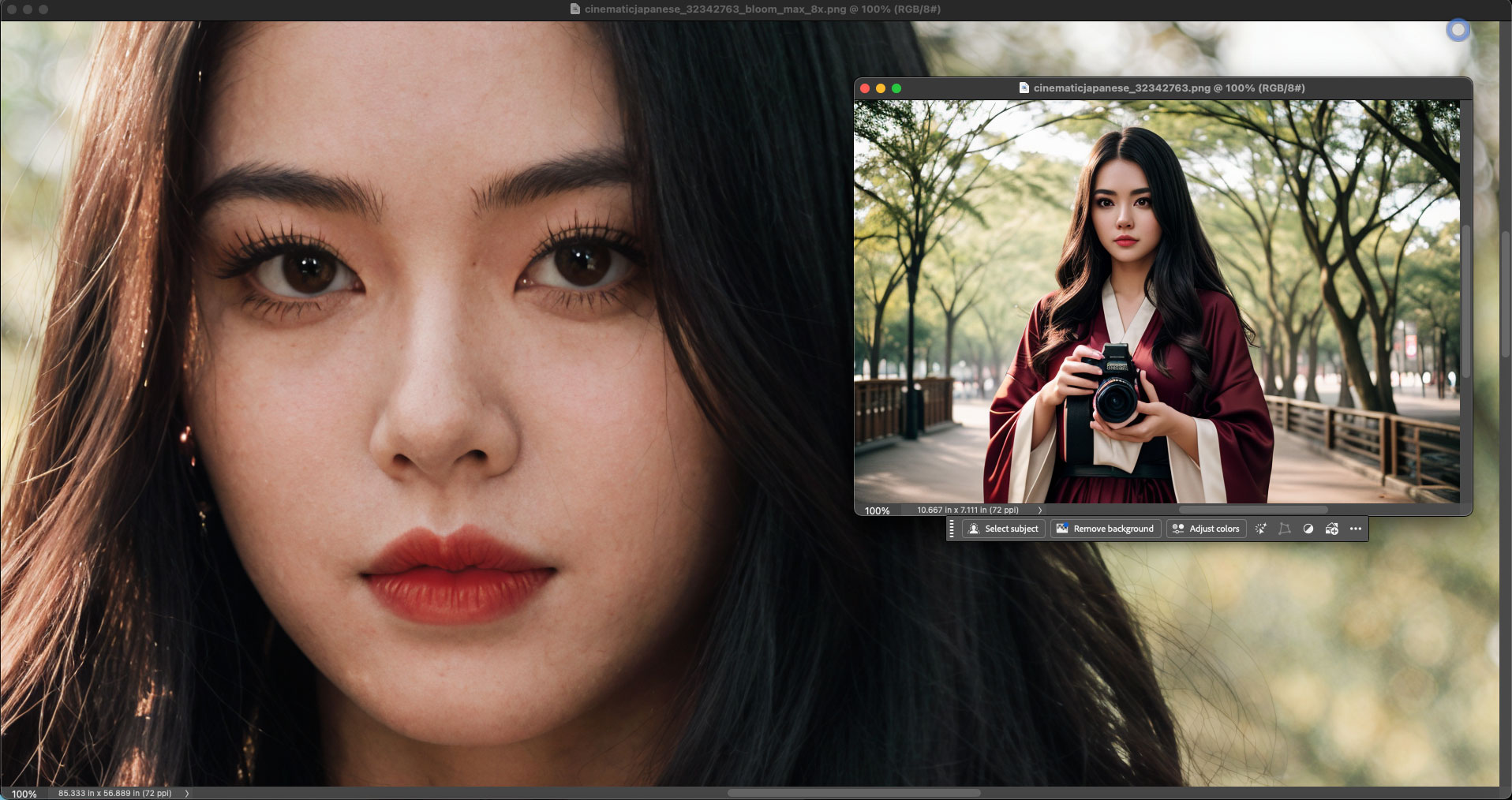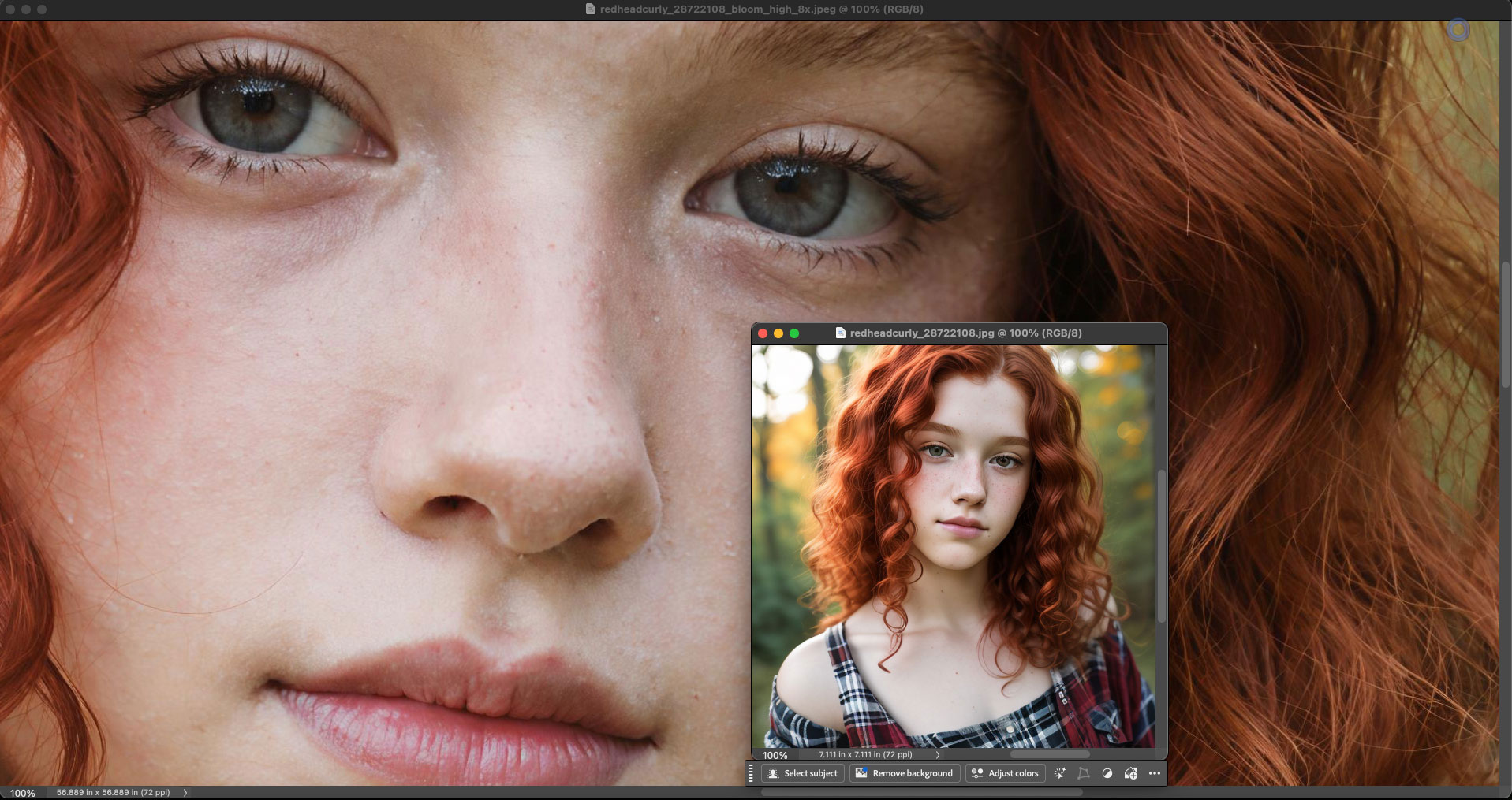 After a minute or two you will see the results and be able to download them. Here I show the original and a portion of the rendered result as seen together, both at 100%, in Photoshop. The original wasn’t too bad to begin with (ie, it was just short of photorealistic), but Bloom took it to the next level without making the girl “plastic”: