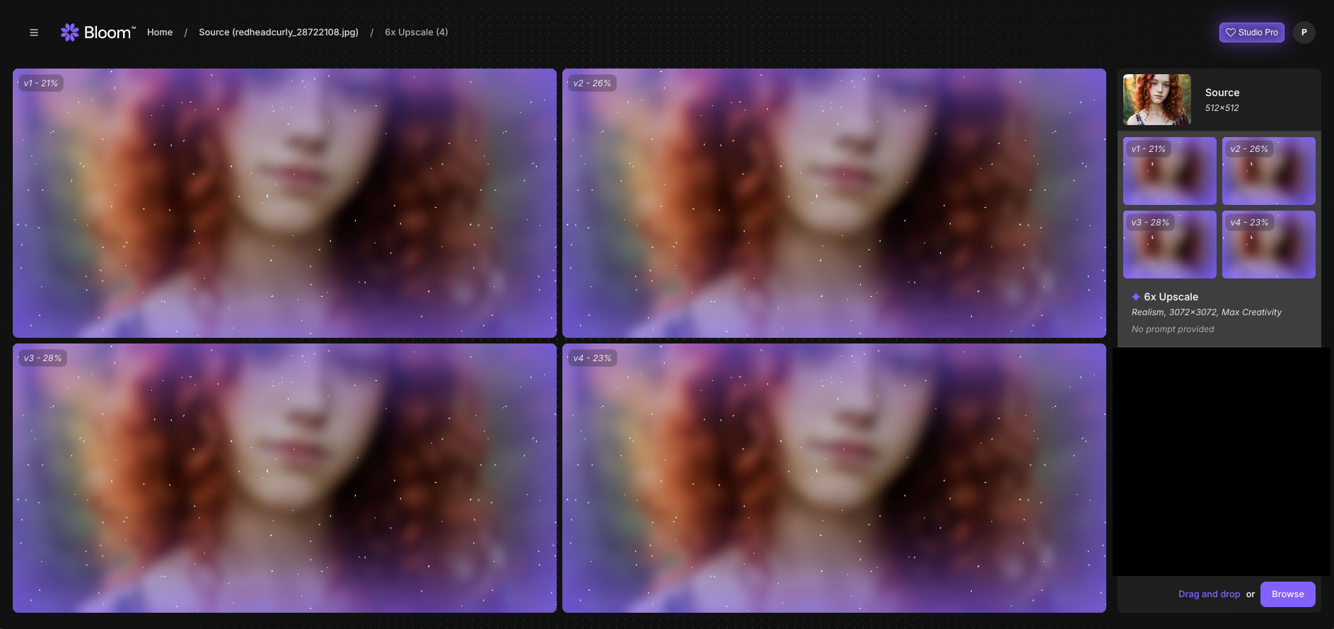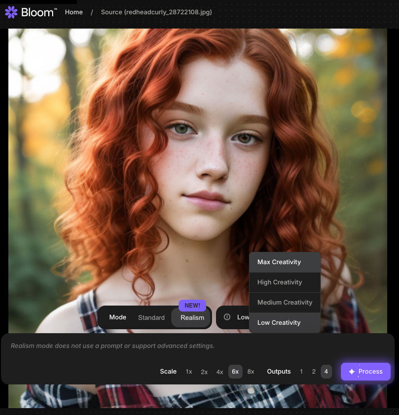 In this case, I chose a 6X upscale with Max Creativity. When invoked, Bloom immediately begins processing your image: